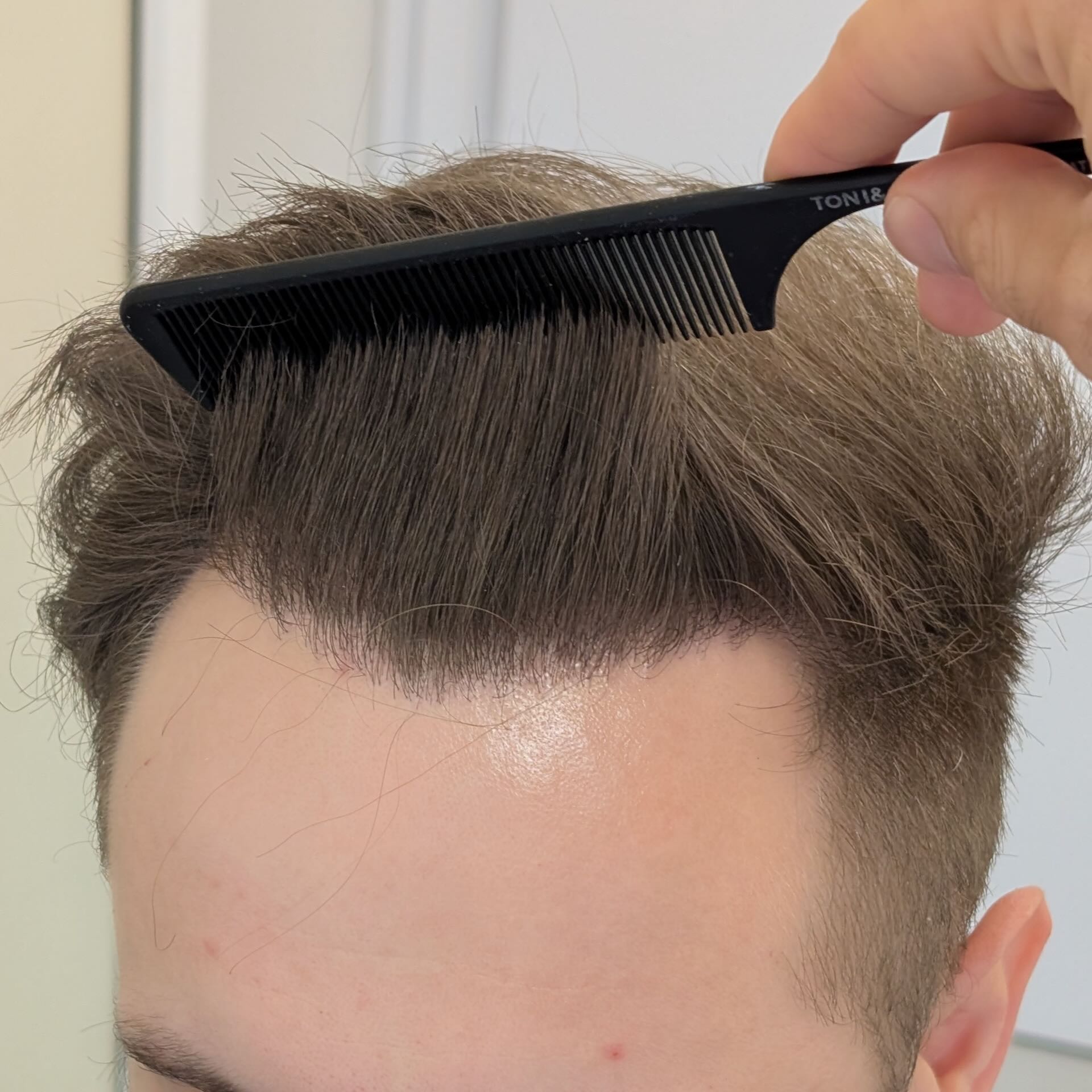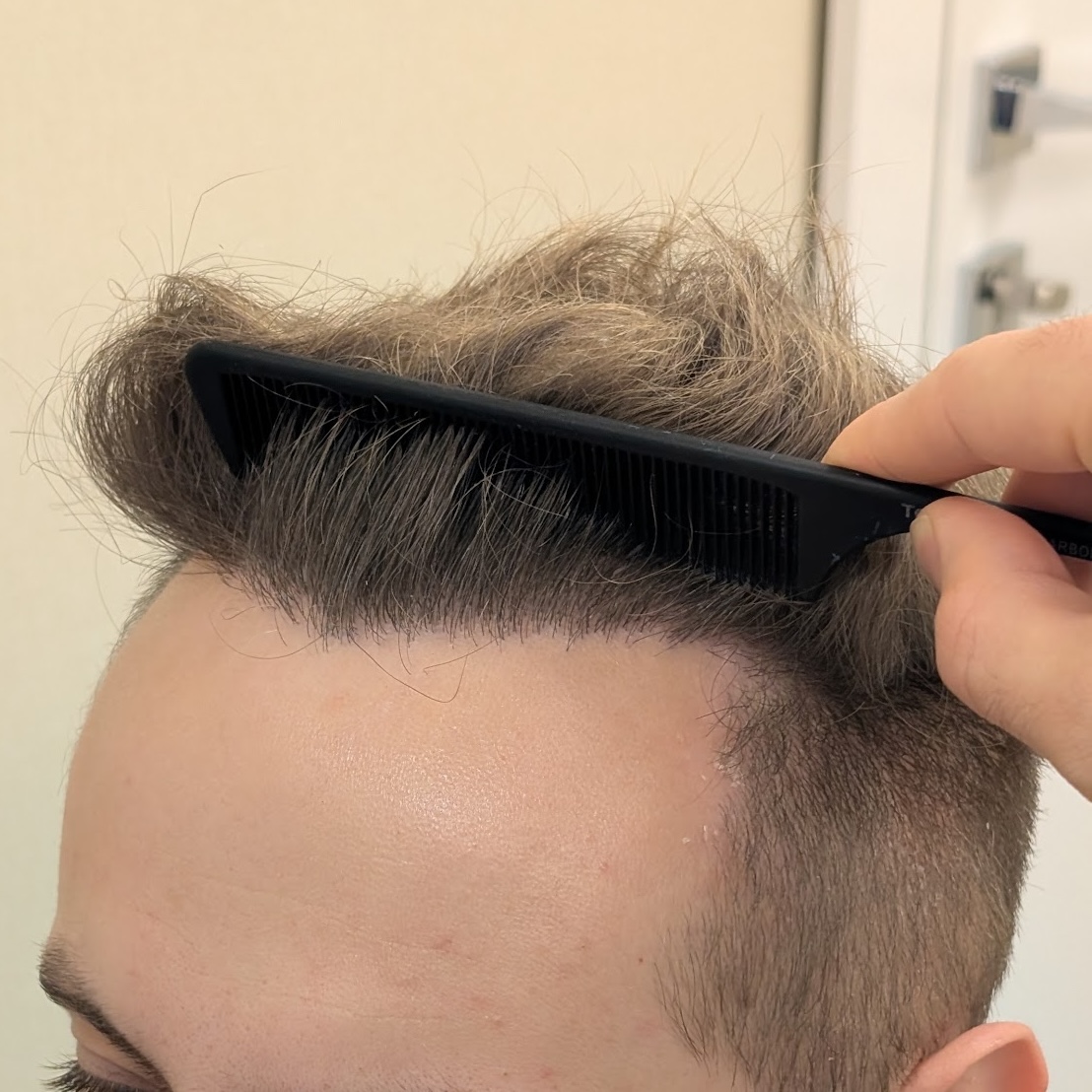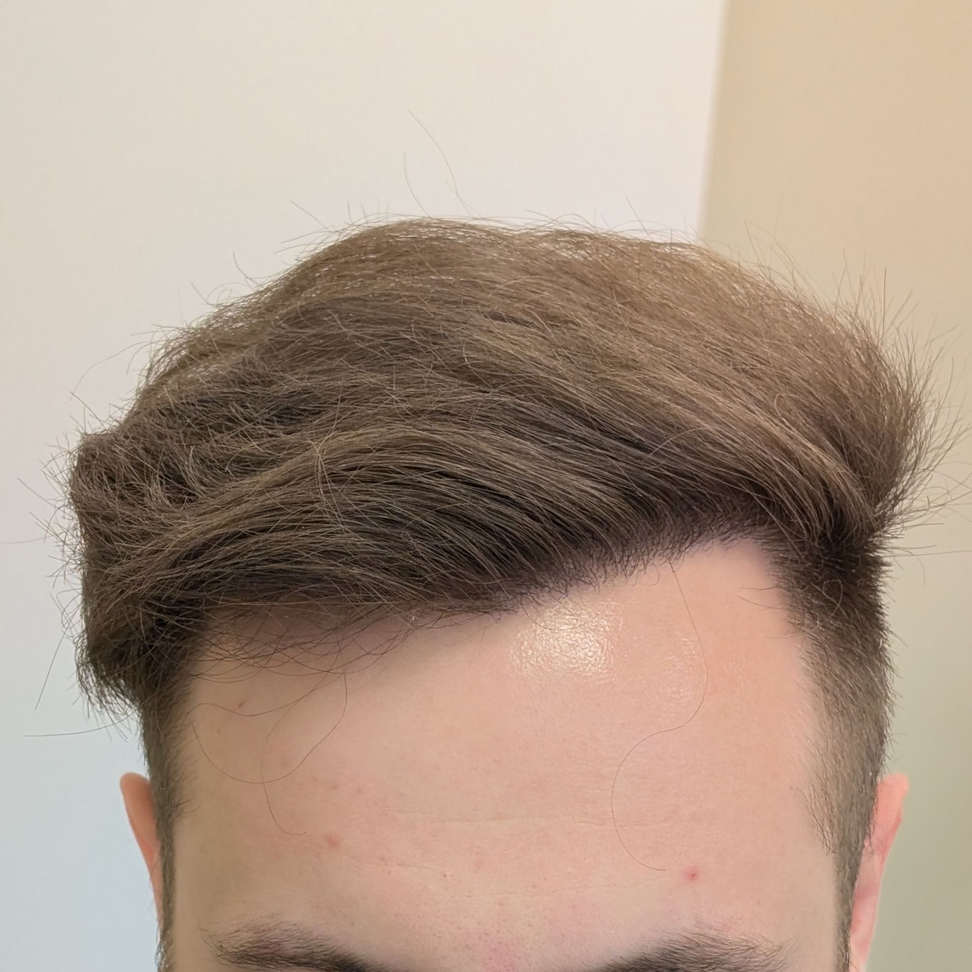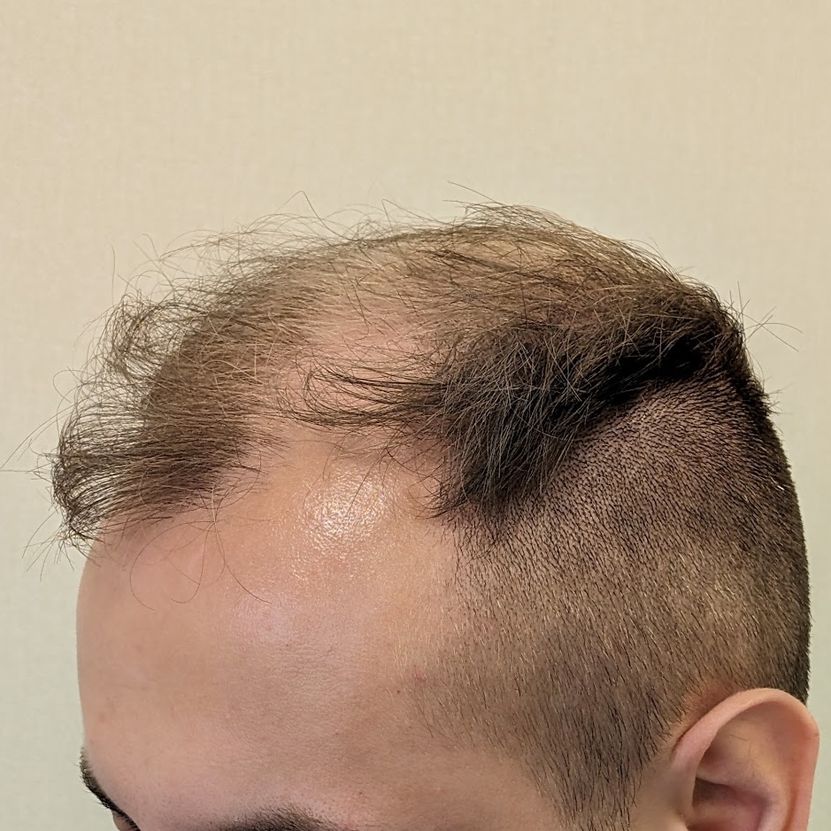 Ten pacjent zgłosił się do nas z zaawansowanym łysieniem Norwood 5. Przeszczepiliśmy 3500 mieszków metodą FUE/DHI, koncentrując się na okolicy czołowej oraz środku głowy. Ze względu na młody wiek pacjenta i możliwy dalszy postęp łysienia zdecydowaliśmy się na zachowawczą linię włosów, pozostawiając okolicę szczytu głowy na dalszy etap w przyszłości. Pomimo dość cienkich włosów udało się uzyskać dobrą gęstość i efekt odpowiadający oczekiwaniom pacjenta.